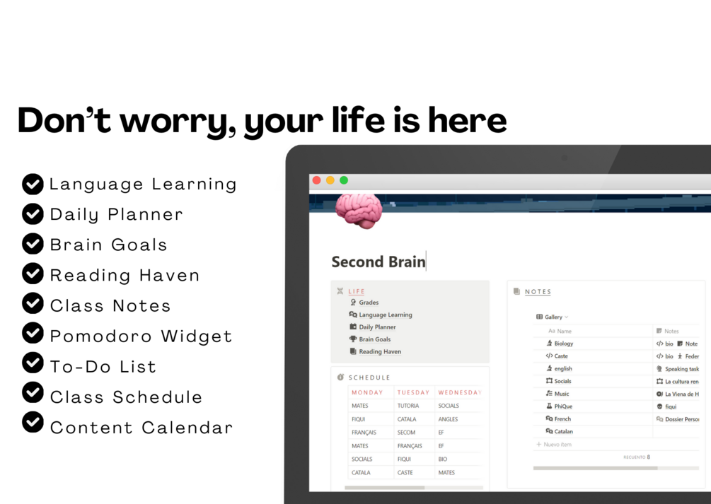Language Learning Place, Daily Planner, Brain Goals, Reading Haven, Class Notes, Pomodoro Method Widget, To-Do List, Class Schedule, Content Calendar